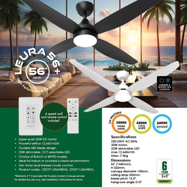 With a durable 56" ABS blade design and a choice of black or white models, the LEURA 56 + is ideal for indoor or covered and protected outdoor residential environments.