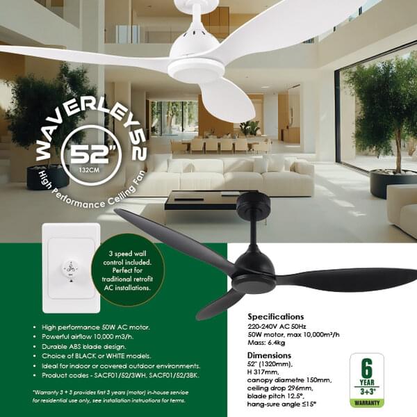 With a durable 52" ABS blade design and a choice of black or white models, the Waverley 52 is ideal for indoor or covered and protected outdoor residential environments.