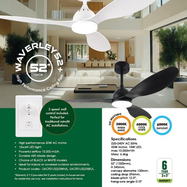 With a durable 52" ABS blade design and a choice of black or white models, the Waverley 52+ is ideal for indoor or covered and protected outdoor residential environments.