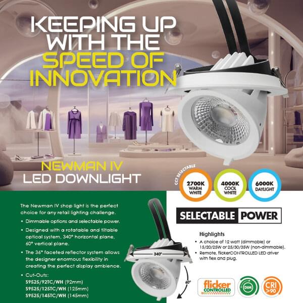 With a choice of 12 watt (dimmable) or 15/20/25W or 25/30/35W (non-dimmable) and selectable power options, the Newman IV with three convenient cut-out sizes, is ideal for any retail lighting challenge.